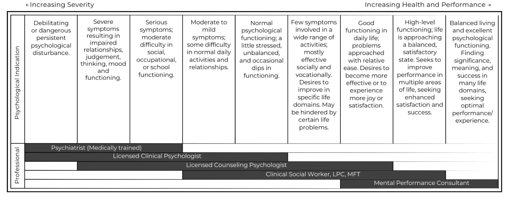 Some licensed professionals are dual-qualified, allowing them to work across both mental health and performance domains. For this reason, sport psychology professionals are best understood along a continuum of services (see below), where athletes may benefit from working with different specialists at different times.